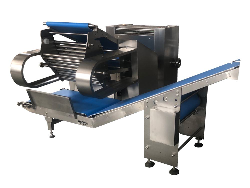 3、多組壓延機為變頻控制,每一道壓輥都采用單機驅(qū)動,通過測距傳感器,實現(xiàn)自動面帶張緊控制,多輥聯(lián)動。進一步簡化操作,保證壓延比,滿足多種工藝要求,加工出質(zhì)量穩(wěn)定的面帶。